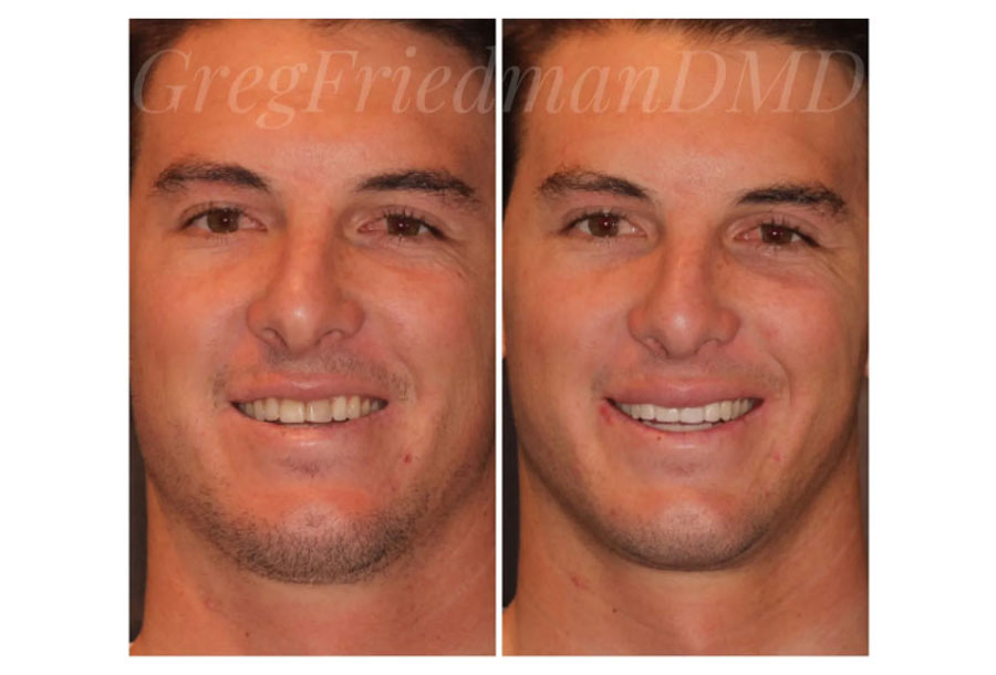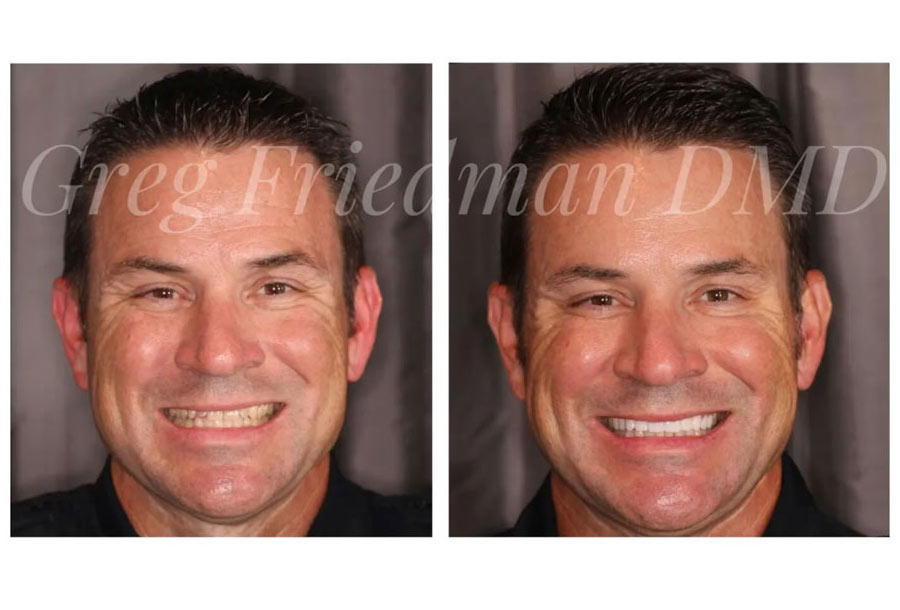 Go Padres! (If you know, you know!) Dr. Friedman had the pleasure of restoring this smile with upper 12 & lower 12 porcelain restorations. This restorative dentistry patient had a collapsed bite from wear over the years bringing his nose & chin closer together. Opening his bite to proper alignment changed his profile to ideal placement for improved smile & face.