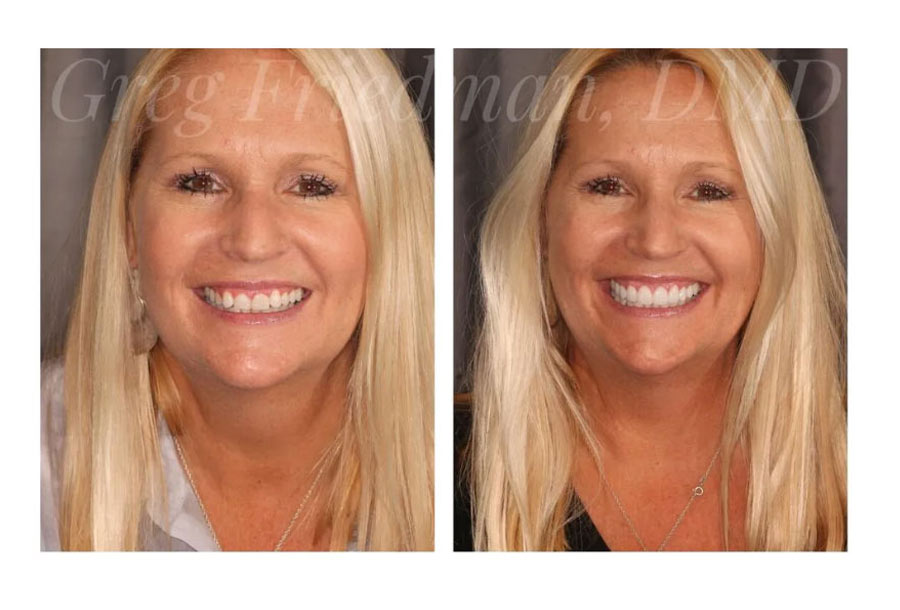 This patient wanted a brighter, more even smile. She also wanted to “show more teeth” with she smiled. After discussing her options for treatment, she had teeth whitening with our Zoom in-office whitening procedure. Then, Dr. Greg Friedman placed 8 upper porcelain veneers for a very natural and beautiful result.