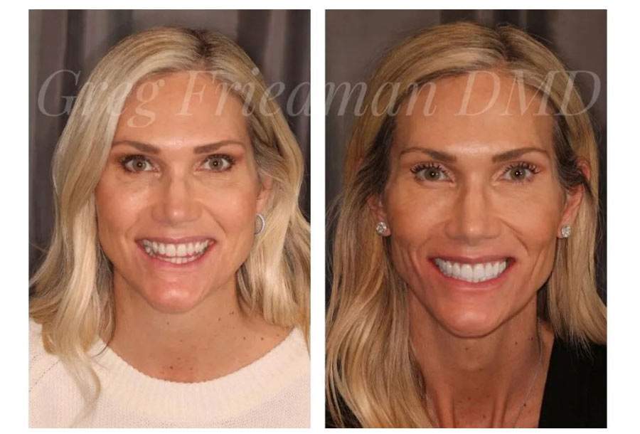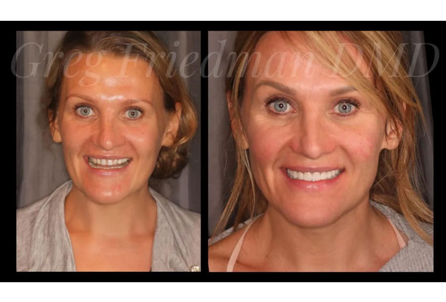 This patient wanted to improve the appearance of her smile to represent her fun personality. Over time, her bite collapsed from natural wear shortening her teeth as well as the space from her nose to her chin. Dr. Friedman restored her bite with full mouth reconstruction consisting of upper 12 and lower 10 porcelain crowns & veneers. This procedure is often referred to as a dental facelift. “Wow!”