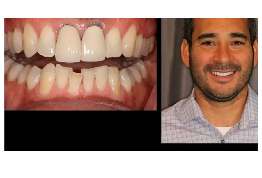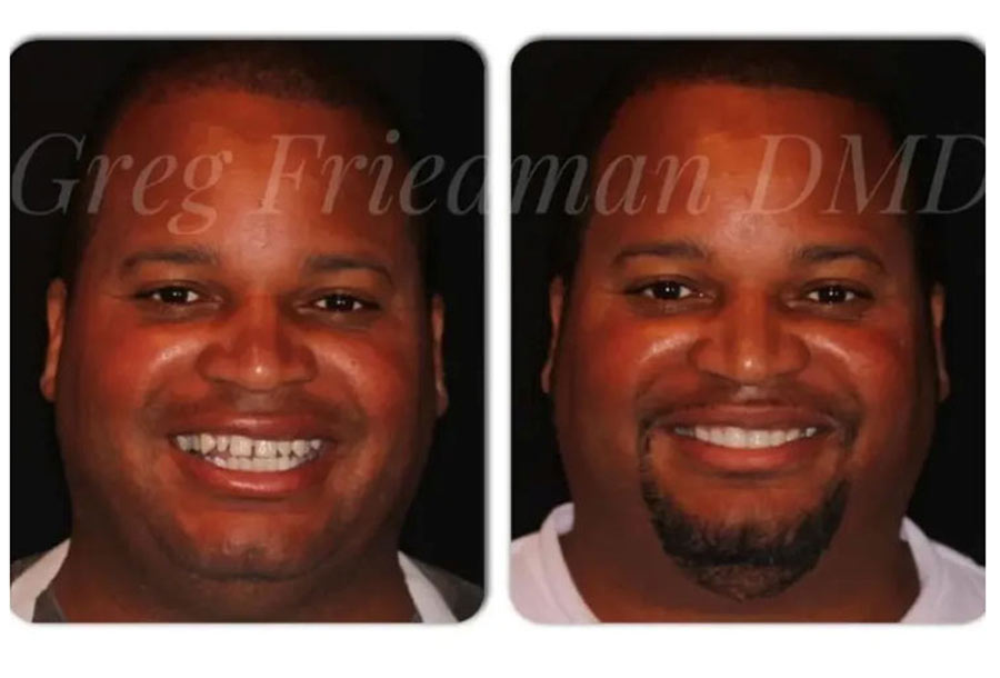 Smile transformation courtesy of Dr. Friedman by placing a combination of porcelain crowns & veneers as well as whitening his entire smile before the restoration placement with Deep Bleaching. Dr. Friedman then placed 12 upper and 8 lower porcelain restorations to restore and open the bite as well as improve over all aesthetics.
